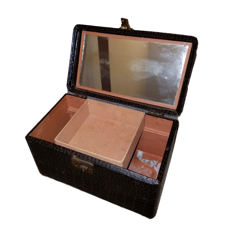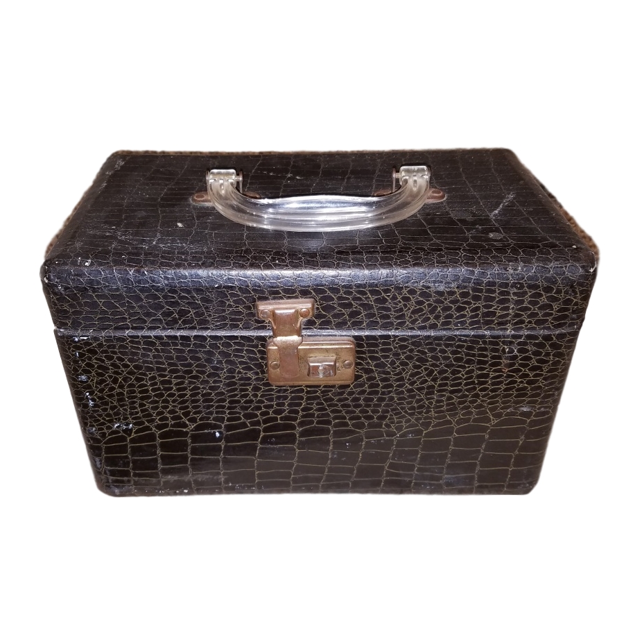 Description: Cute black vanity train case with clear plastic handle. Pictured in the middle in front in the last photo.