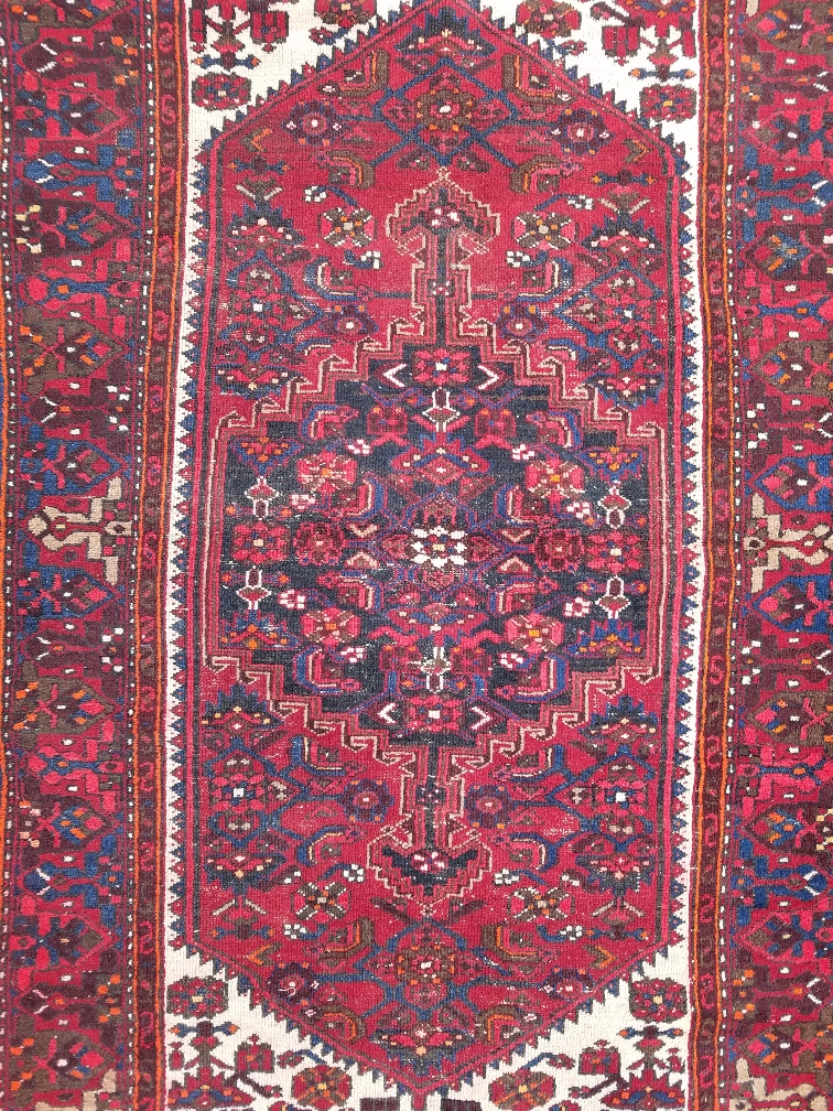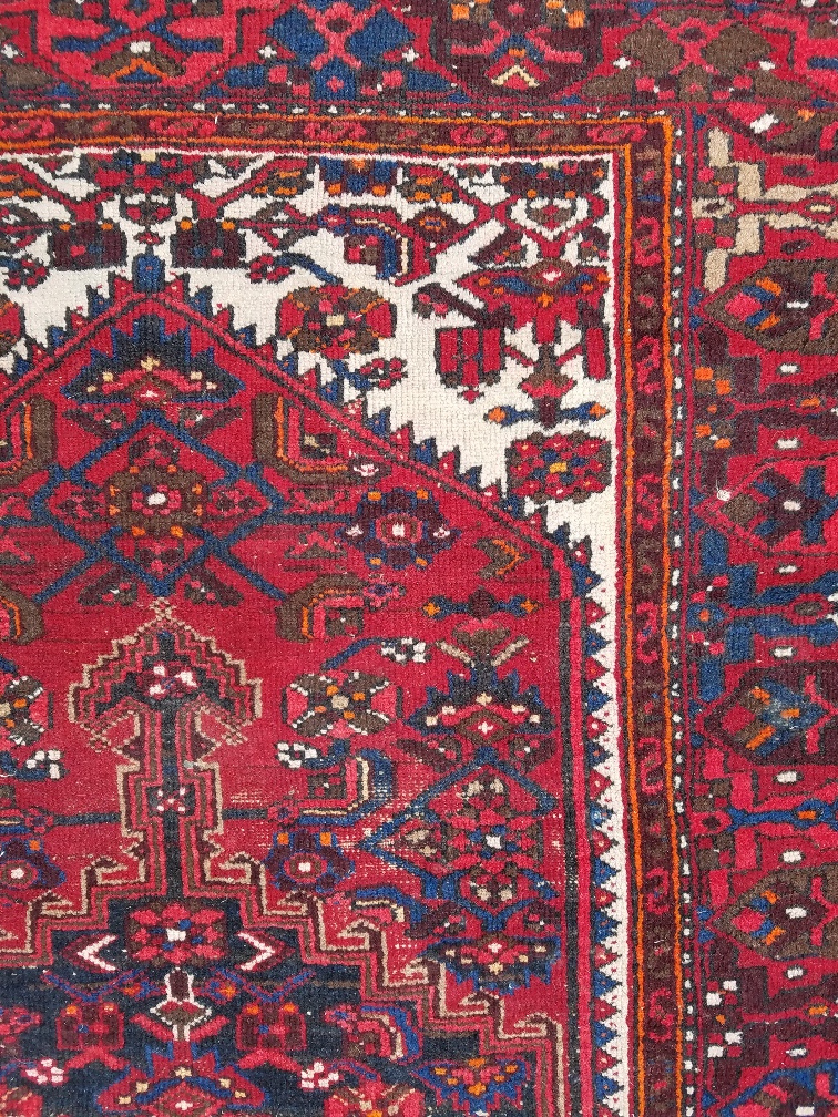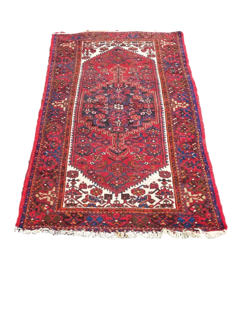 Description: Our bright red patterned rug makes a statement with red, orange, blue, biege, and brown colors.