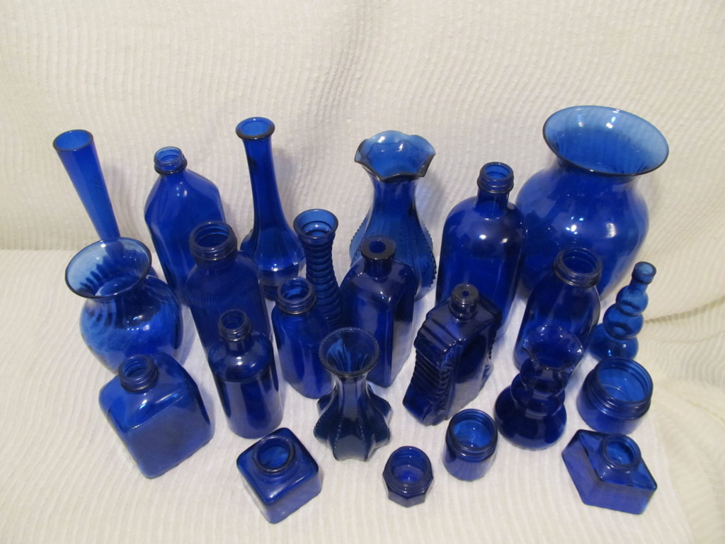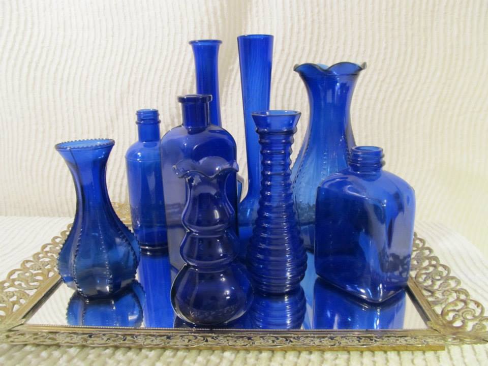 Description: Our collection of cobalt blue vases, old bottles, and cosmetic jars will bring the striking cobalt blue color to any table. Perfect for florals. Rental fee includes 77 pieces of cobalt blue glass.
