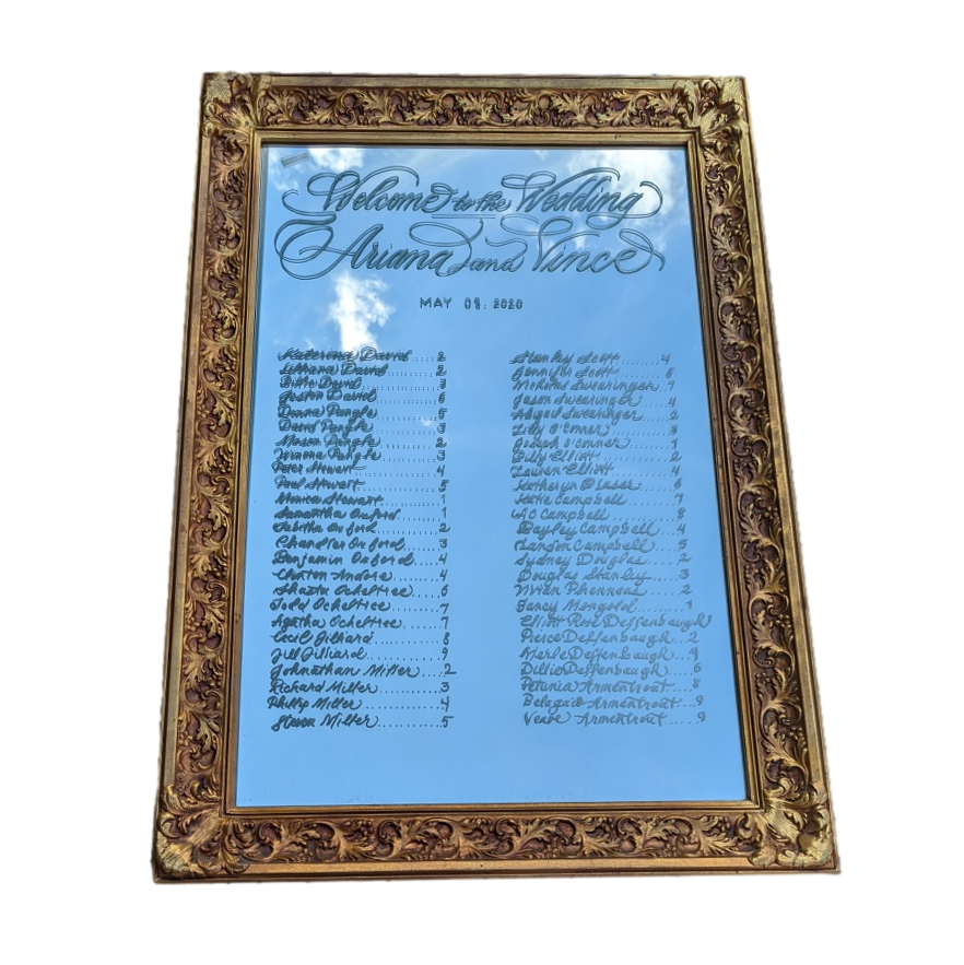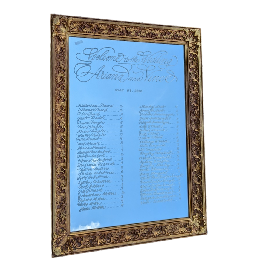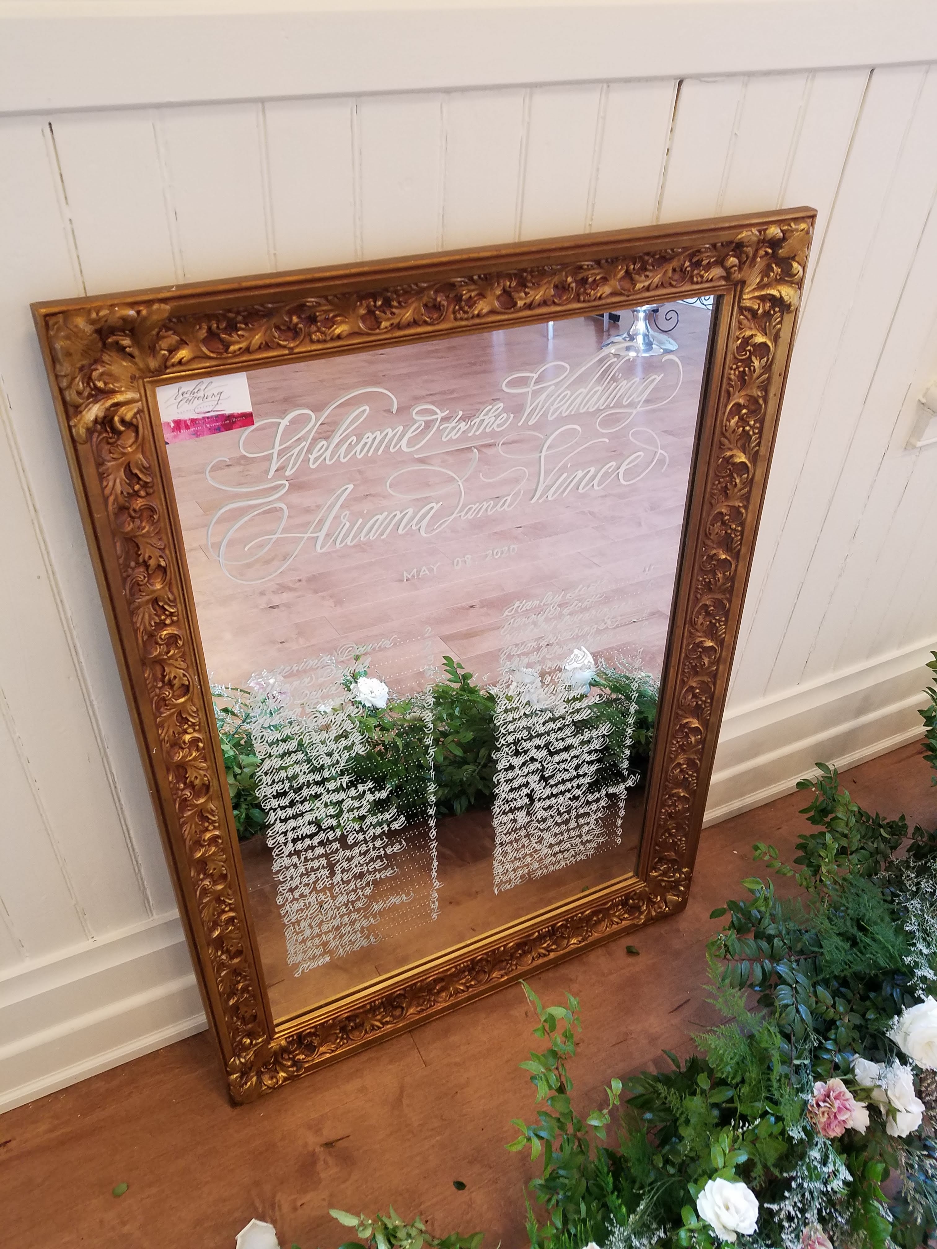 Vintage and specialty rentals ready for your event Photo by Sarah Featherstone Photography Collection Signs, Mirrors, And Easels Gold Ornate Mirror Search
