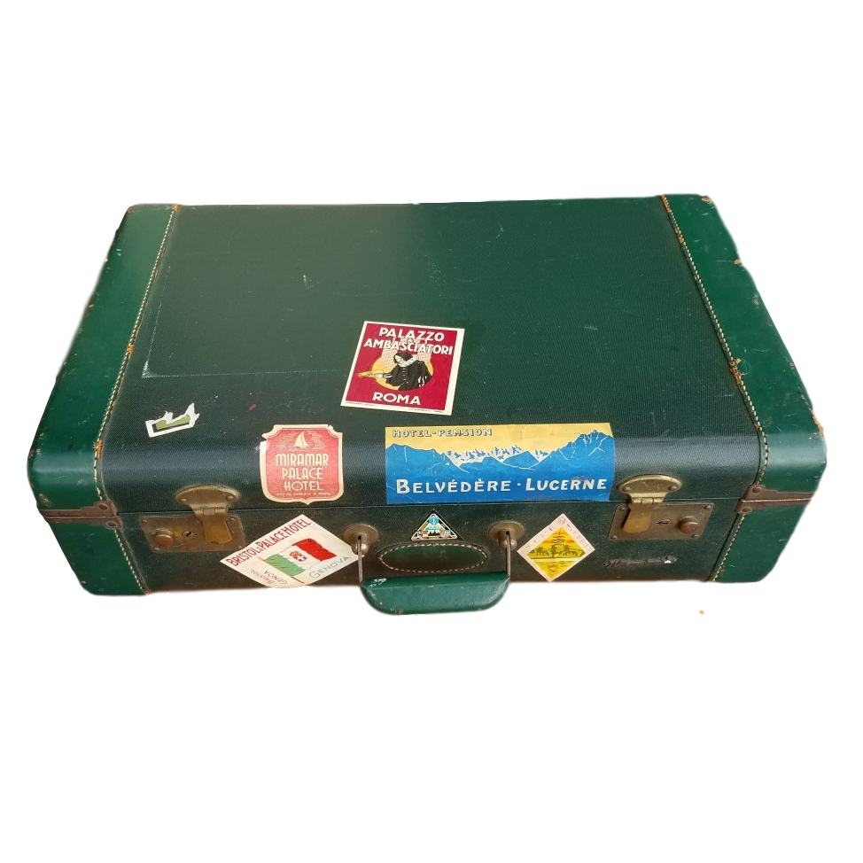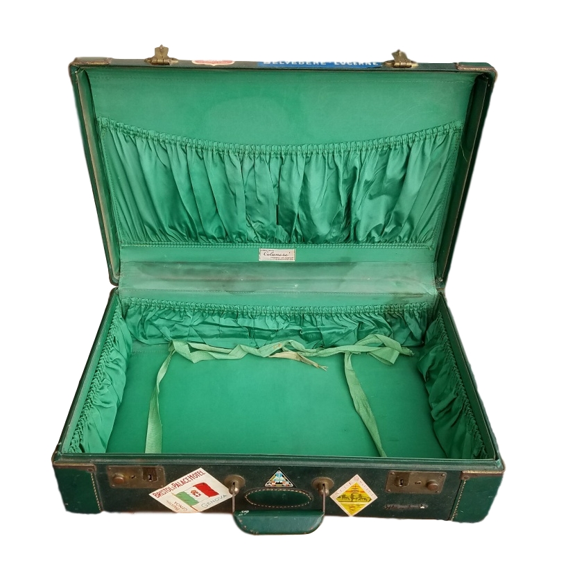 Description: Green suitcase with silky green interior lining and fun vintage travel labels.