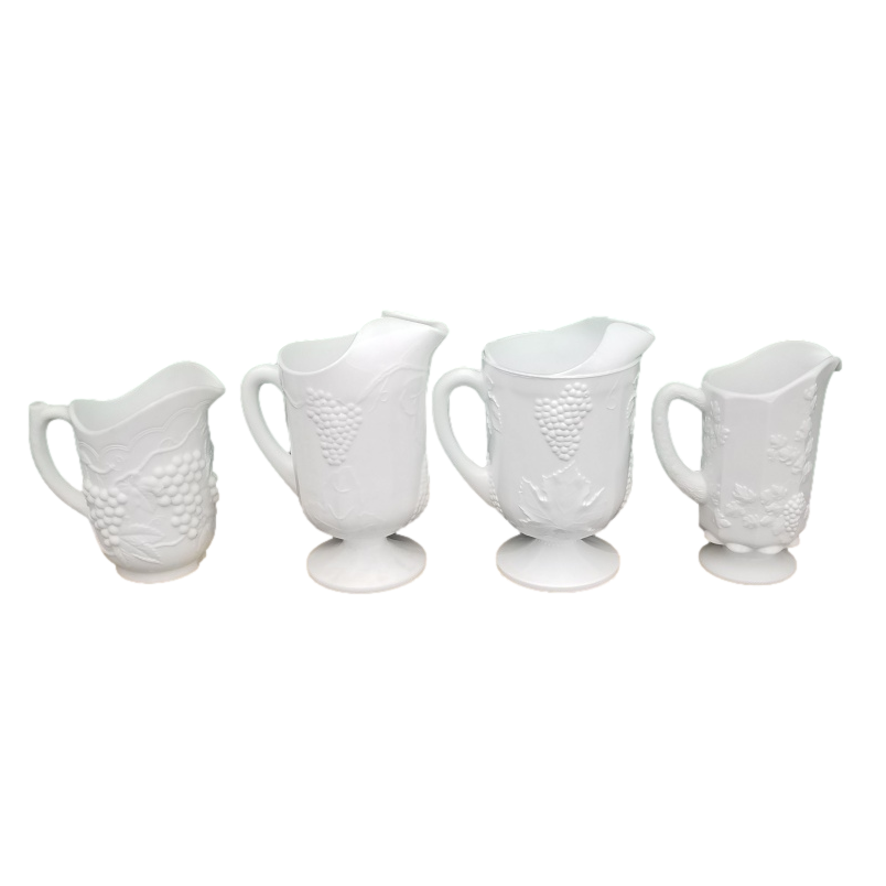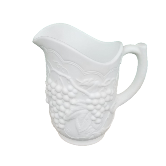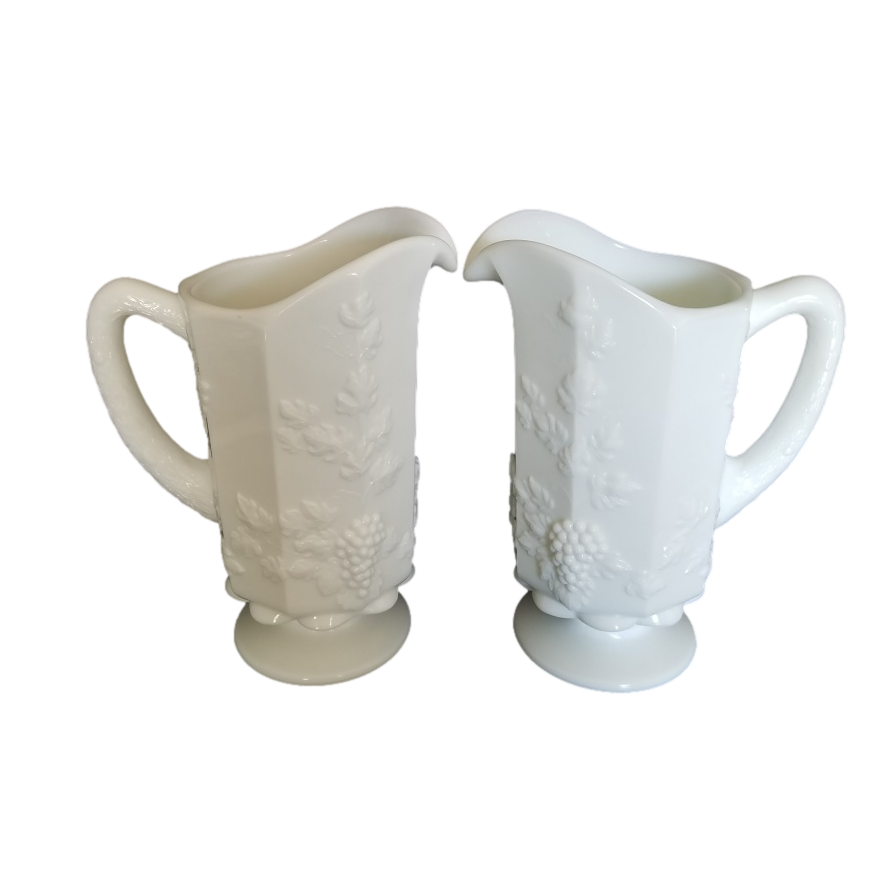 Description: Various milk glass pitchers make a wonderful large vase for florals. We love that you cannot see through the milk glass and the white virtually disappears.